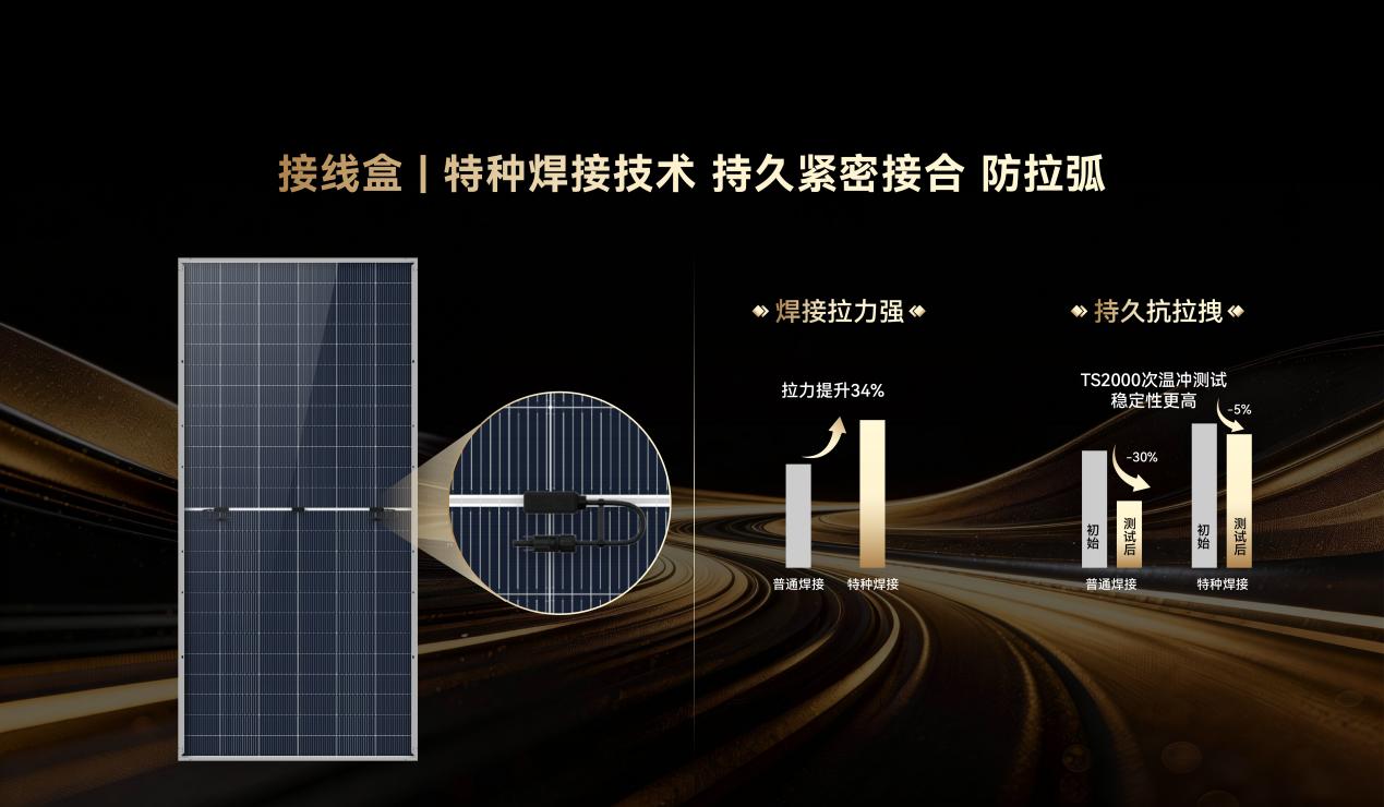 首先,引入特种焊接技术,实现微米级高精度焊接,使接线盒的焊点拉力比普通焊接提升34%;经2000次极端温冲测试后,特种焊接拉力保持率仍在95%以上,而普通焊接衰减高达30%,从源头规避了虚焊导致的拉弧风险。