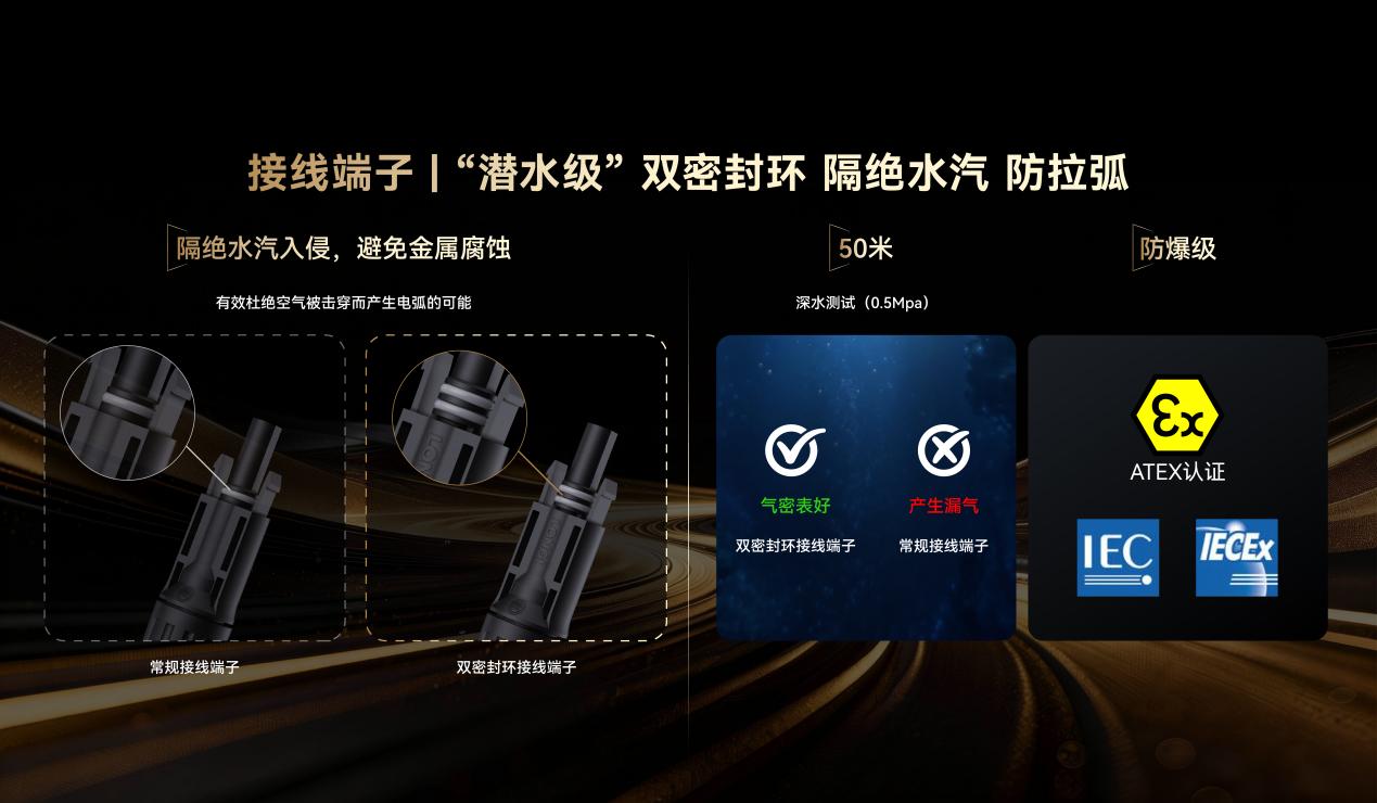 其次,采用 “潜水级”双密封环接线端子。常规单密封圈端子易因水汽入侵导致腐蚀、接触不良。Hi-MO X10的双密封圈结构,能有效隔绝水汽、腐蚀性气体,通过50米水深级气密性测试,并获得ATEX/IECEx防爆认证,从物理上杜绝空气被击穿产生电弧的可能。