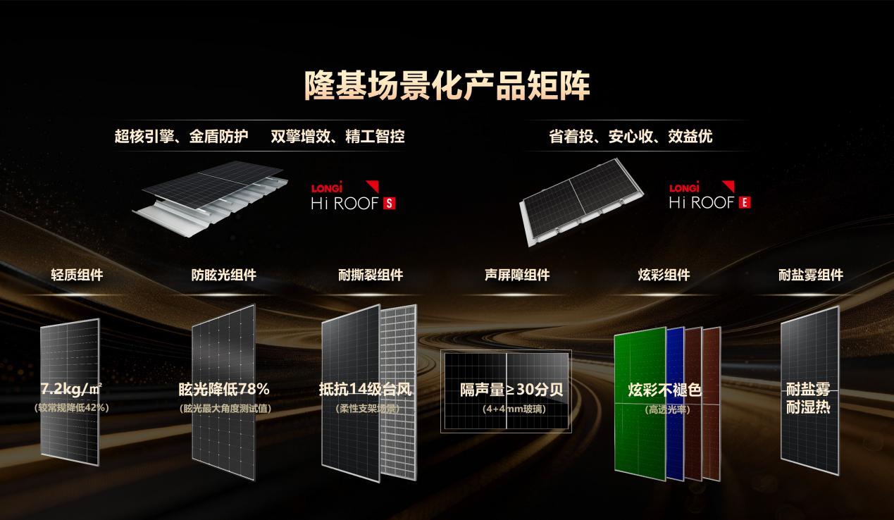 从特种防火组件到轻质防积灰、耐盐雾耐湿热、水务防撕裂、防眩光、声屏障及炫彩组件,隆基此次发布会以丰富的产品矩阵,全面覆盖各类场景的应用需求。