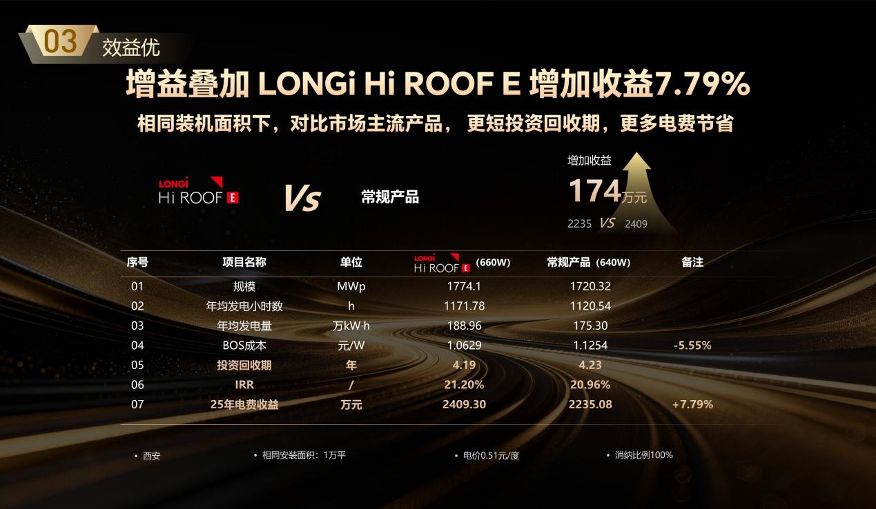 收益测算显示,以西安某1万平米工商业屋顶为例,同样的屋顶面积,对比市场最高的640W产品,采用LONGi Hi ROOF E (660W)系统,BOS(初始投资成本)成本降低了5.55%,25年可多赚174万元。