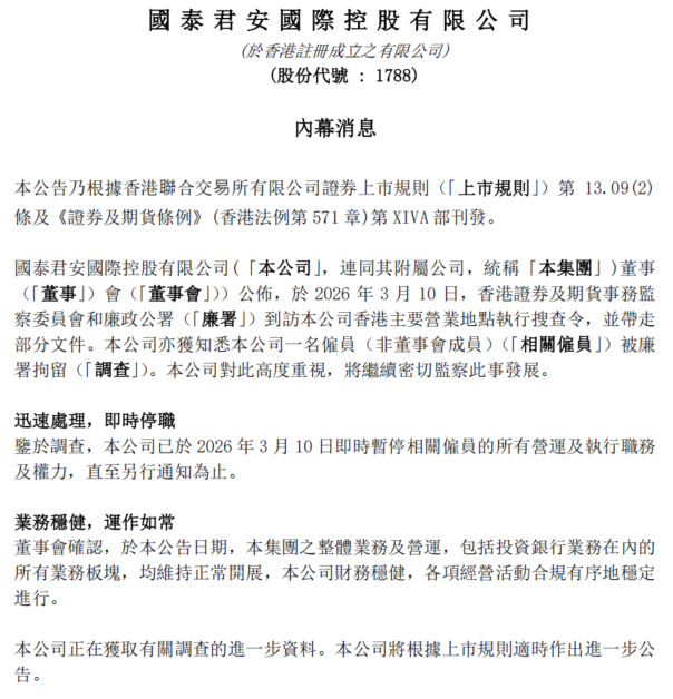 3月12日盘前,国泰君安国际(1788.HK)发布公告称,3月10日,香港证监会和廉政公署到访公司香港主要营业地点执行搜查令,一名雇员(非董事会成员)被廉政公署拘留。公司已即时暂停相关雇员的所有运营、执行职务及权力。