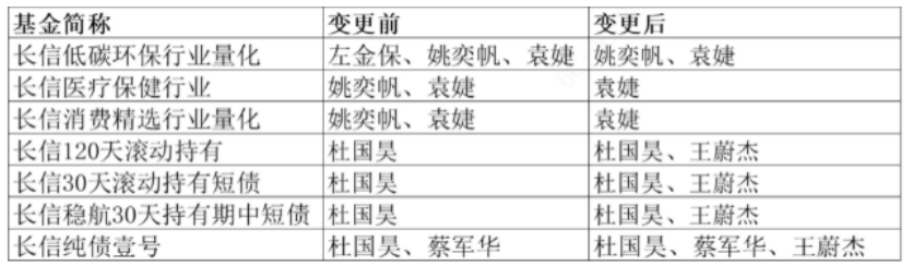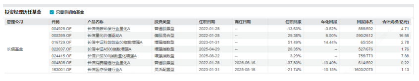 核心投研团队的不稳定,进一步加剧了长信基金的发展困境。2025年5月17日,长信基金单日发布7则基金经理变动公告,涉及4只产品增聘基金经理、3只产品基金经理离任,其中就包括长信低碳环保行业量化、长信医疗保健行业、长信消费精选行业量化等核心产品。