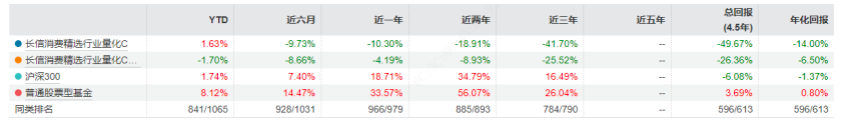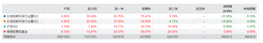 具体来看,长信低碳环保量化(004925)近一年总回报率为-23.58%,年化回报-5.74%,在613只同类产品中排名第466位,处于行业后3%梯队;长信消费精选行业量化C近一年总回报率更是低至-49.67%,年化亏损14%,同类排名596/613,落后同类平均水平25个百分点,不少基民吐槽其"量化投研不及盲目配置"。
