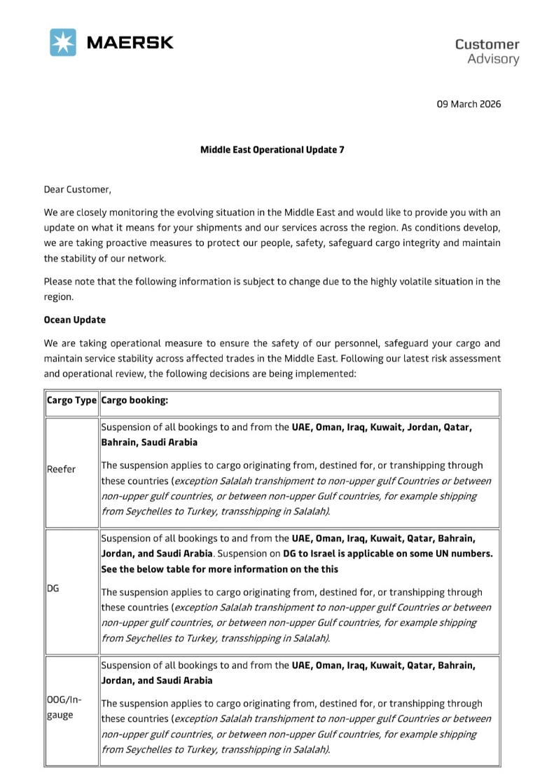 除了原油和天然气油轮外,该地区的货运形势也相当严峻。航运巨头马士基周一发布公告称,即日起暂停接受往返波斯湾港口的舱位预订。