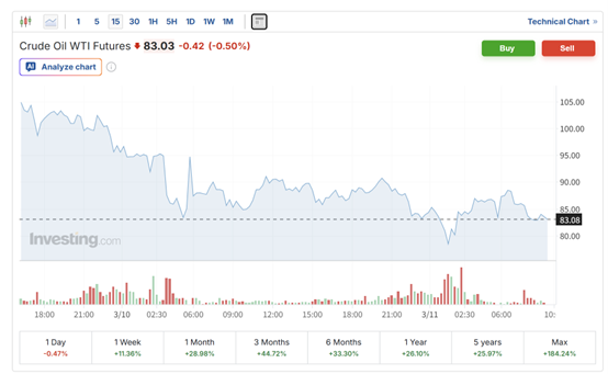 自2月28日美国和以色列对伊朗发动袭击以来,油价已飙升约 40%,本周一曾一度逼近每桶120美元。但多国联合释放石油储备的可能性,以及美国总统特朗普有关“战争基本结束”的表态令油市承压回落。