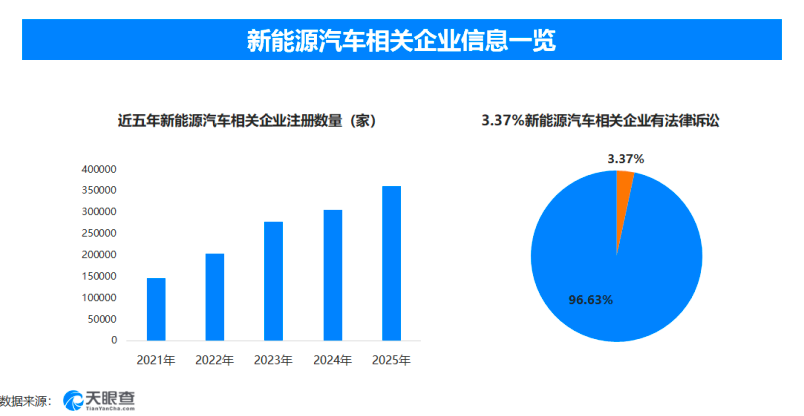 天眼查数据显示,截至目前我国现存在业、存续状态的新能源汽车相关企业超174.9万家。其中,2026年截至目前新增注册相关企业约5.6万余家,从企业注册数量趋势来看,近五年间,新能源汽车相关企业的注册数量呈现出逐年增长的态势,并在2025年达到顶峰。