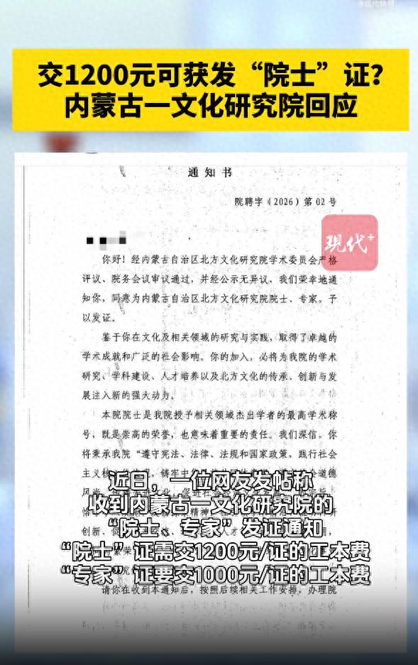 交1200元工本费,就能得“院士”证?近日,一位网友发帖称,收到内蒙古一文化研究院的“院士、专家”发证通知,如需“院士”证就要交1200元/证的工本费、“专家”证要交1000元/证的工本费。4月15日,现代快报记者致电该研究院,一名工作人员表示,这(种做法)是该院第一次开展,院领导觉得不妥,已经叫停。